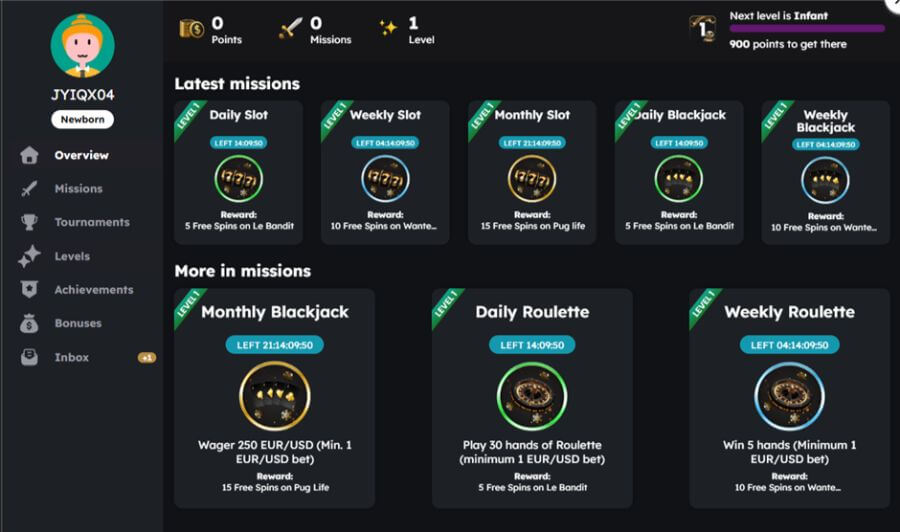 To rack up the points, you can complete missions and also scoop free spins and bonuses at the same time. As well as get access to tournaments, pick up ‘achievements’ and earn points for levelling up.